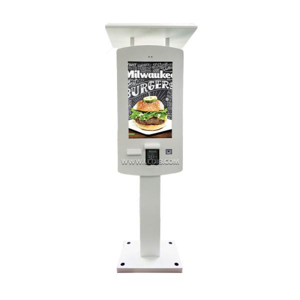 This is outdoor standard automatic self service payment machine pos terminal, can be used for drive through restaurant, has a cover on top for decoration, 2000nits high brightness with light sensor to save consumption power, galvanized steel with waterproof powder painting structure and air cooling fans system insid for dissapation.